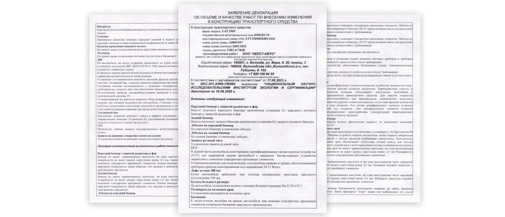 Заявление-декларация на переоборудование оформляется в соответствии с требованиями законодательных норм. В противном случае в легализации вносимых изменений будет отказано. В нем подробно описывается конфигурация автомобиля после доработок в сертифицированном СТО, полное описание всех проделанных работ, а также марка, модель ТС, тип, цвет, регистрационный знак, VIN, кузов, наличие прицепа и другие данные. К документу прикладывается копия сертификата сервиса с указанием расшифровки кодов и услуг.